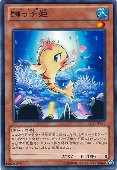 このカードが召喚・特殊召喚に成功した時、このカードをゲームから除外して発動できる。デッキから「鰤っ子姫」以外のレベル4以下の魚族モンスター1体を特殊召喚する。