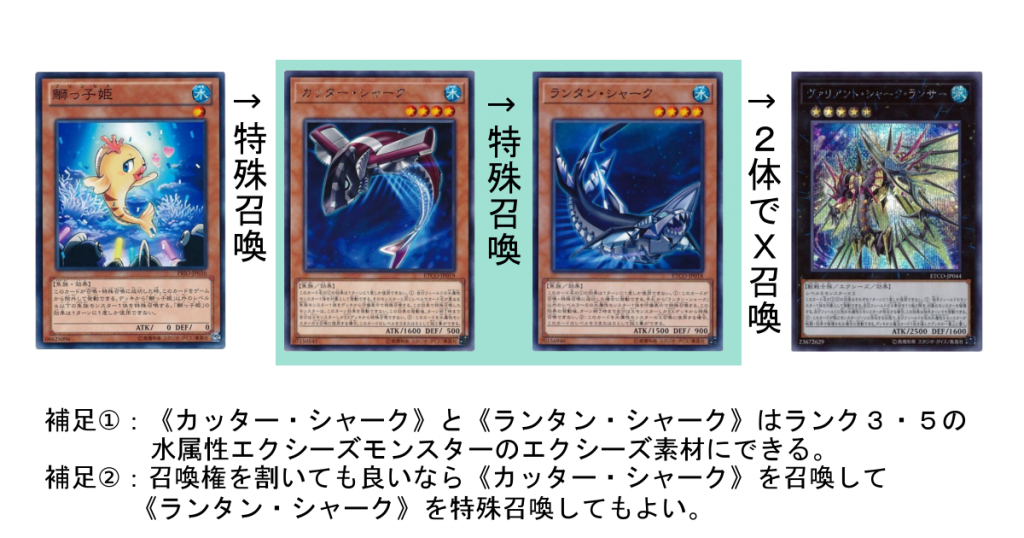 魚族モンスターである《カッター・シャーク》《ランタン・シャーク》は、水属性エクシーズモンスターをエクシーズ召喚する際に「ランク3・5」のエクシーズ素材としても使える効果を持っています。つまり、ランク5である《ヴァリアント・シャーク・ランサー》を比較的展開しやすいレベル4モンスターで出せるわけです。おそらく一番よく見るパターンでしょう。