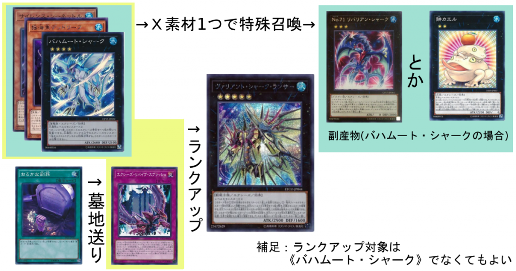 水属性でお馴染みのランク4エクシーズモンスター《バハムート・シャーク》を場に出し、それを罠カード《エクシーズ・リバイブ・スプラッシュ》の墓地効果でランクアップさせて《ヴァリアント・シャーク・ランサー》をエクシーズ召喚する、という流れです。《ヴァリアント・シャーク・ランサー》を出すだけならば《深淵に潜む者》など他の水属性ランク4エクシーズモンスターを起点にしてもいいですが、ここで《バハムート・シャーク》を用いることで「水属性エクシーズモンスターをもう1体並べる」条件を達成できます。