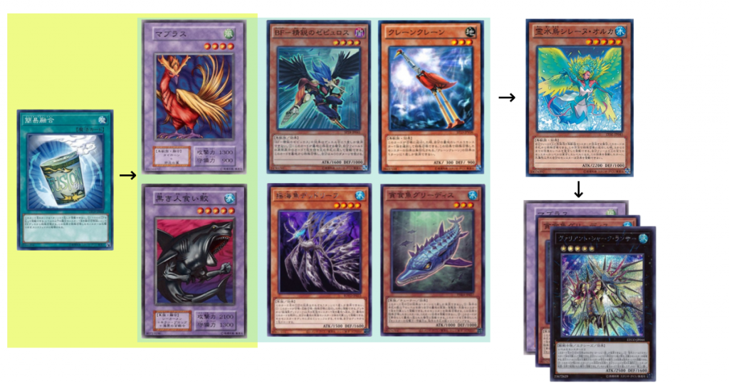 基本的には魚族モンスターを展開しながら汎用カードで鳥獣族モンスターを使う、という流れになります。足りない種族を《簡易融合》で補ったり、墓地のレベル3魚族モンスターを《クレーンクレーン》で蘇生したり、フィールドの永続魔法を《BF-精鋭のゼピュロス》でバウンスしながら特殊召喚したり……とにかく、他の展開ルートと比べると難易度は上がります。